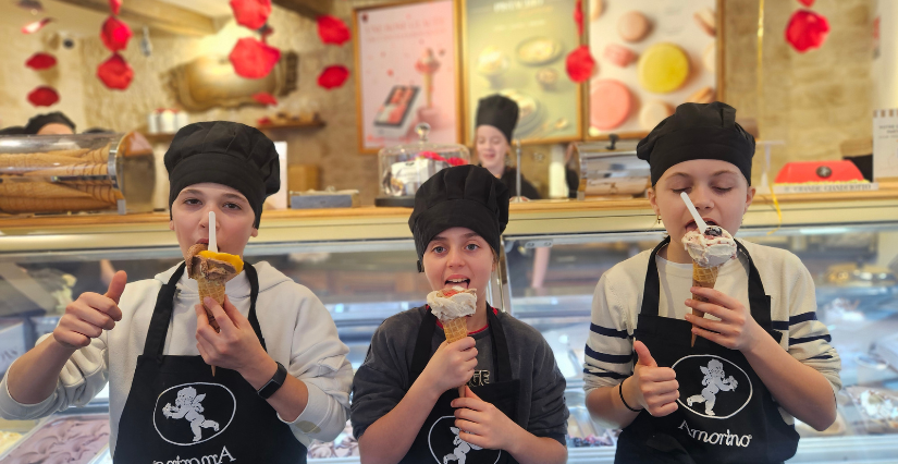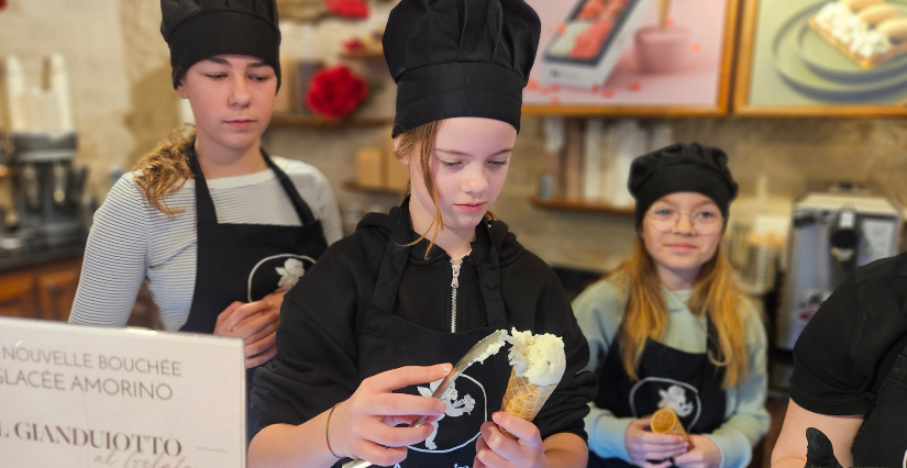 La boutique Amorino est entièrement privatisée pendant 2 heures rien que pour nous — une occasion rare et privilégiée ! Avoir une boutique de glaces rien que pour soi, ça n’arrive pas tous les jours : une expérience aussi insolite qu’unique qui met immédiatement des étoiles dans les yeux des enfants.