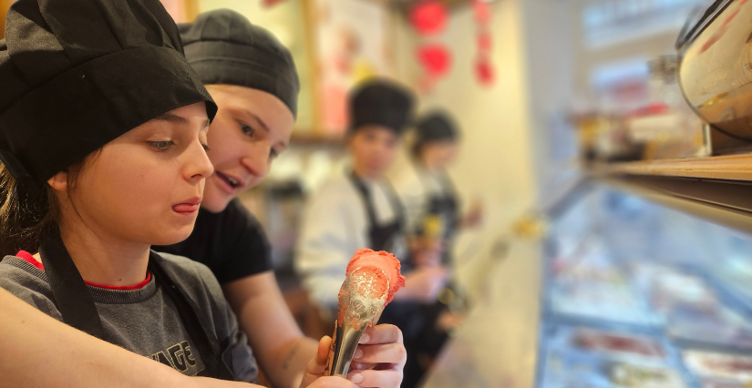 Spatule en main, les enfants découvrent la technique emblématique d’Amorino : la glace en forme de fleur.