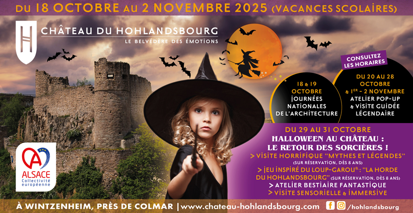 Les 29, 30 et 31 octobre, Le château du Hohlandsbourg se transforme en un lieu de mystères et de frissons ! Venez vivre une expérience inédite mêlant légendes locales et jeu immersif, dans une atmosphère envoûtante où l’imaginaire côtoie le patrimoine. Sur réservation